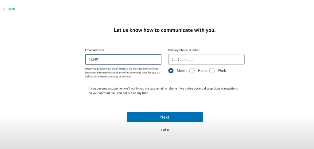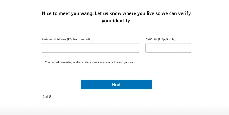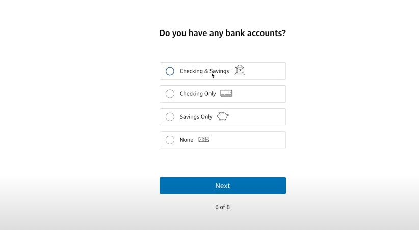这边去选择一下有没有银行账户,这个地方一定要选择有,因为如果你没有银行账户的话,他大概率是不会给你批这个信用卡的,因为给你批了这个信用卡,你没有银行的支票账户,就没有办法去给这张信用卡还款。所以说我们这边去选择支票或者储蓄。