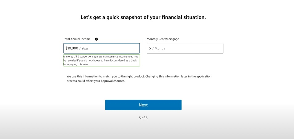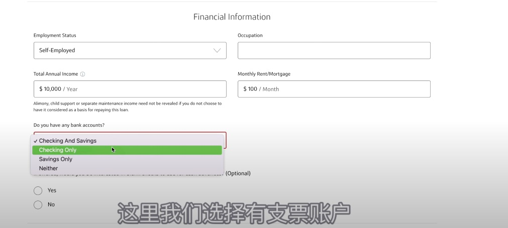 下面就输一下自己的雇佣状态,然后收入。每个月的月租房贷,这里我们选择有支票账户。