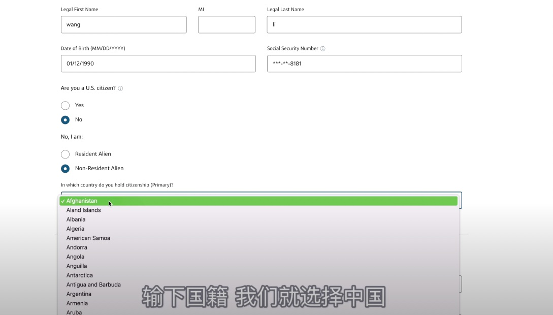 我们直接点击申请。下面的话就输一下自己的名字 生日 ITIN号码,下面问是不是美国的公民,选择不是,然后是不是美国的税务居民,选择不是。输下国籍 我们就选择中国。
