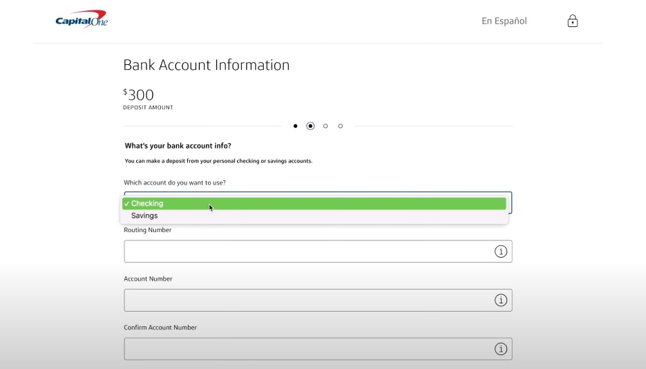我这边先存300美元,接下来去选一下自己要存款的银行账户,选择支票账户,然后输一下自己的美国支票账户的路由号码和账户号码。所以说如果你没有美国的银行账户,这个时候信用卡是根本无法存入押金,无法申请成功的。