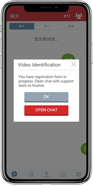 6.回到App,打开左下角聊天框,点击“与银行聊天”,发送开户验证