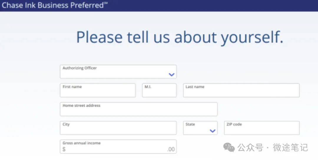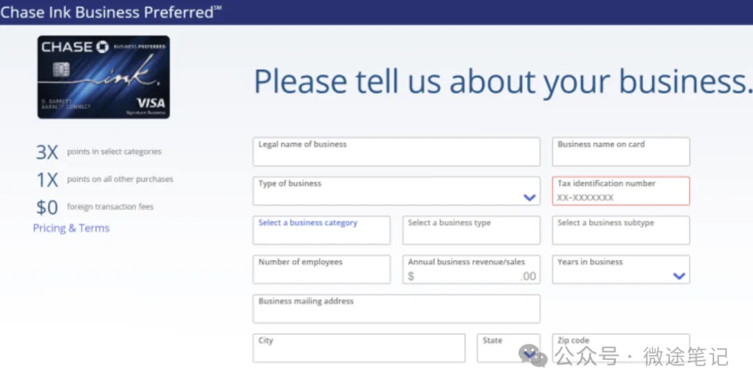 申请商业信用卡的流程与个人信用卡基本一致,主要多出一部分商业相关信息填写。以 Chase Ink Business Preferred 为例,流程如下:
