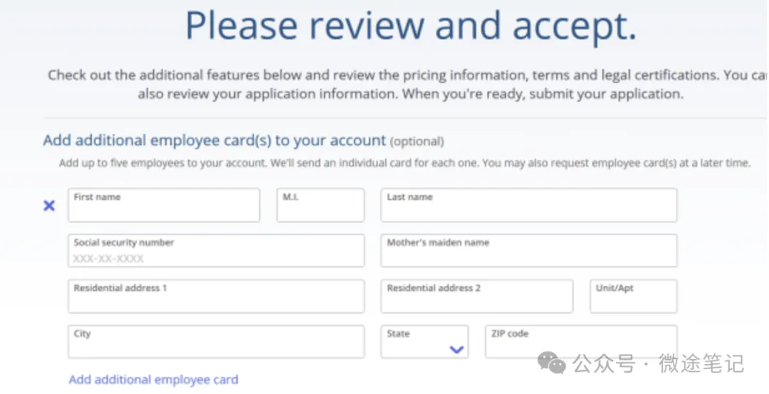 如需为员工申请附属卡,需填写其姓名及 SSN。