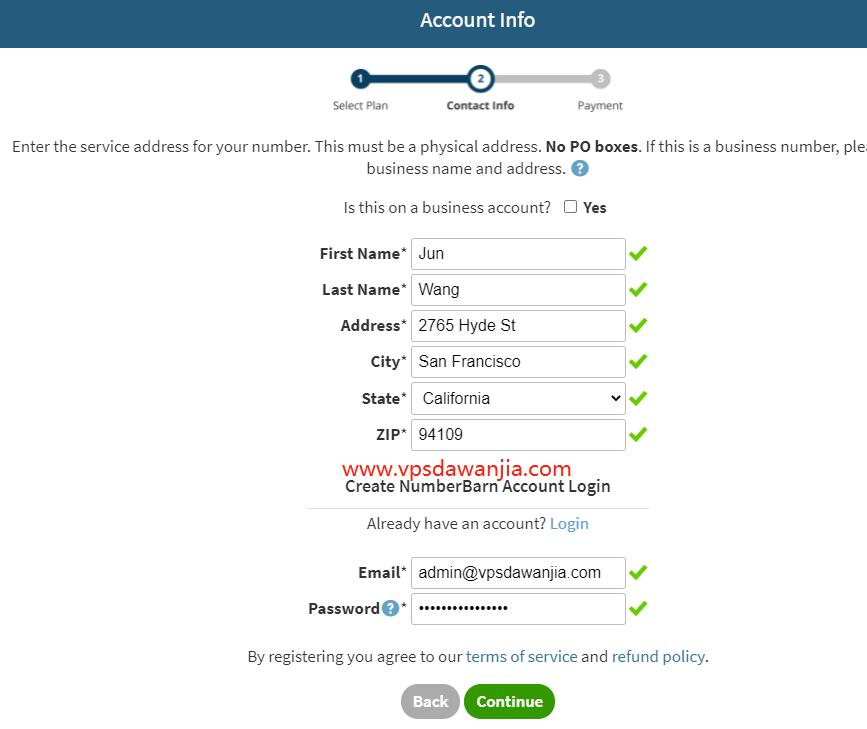 4.點“Continue”輸入姓名,服務地址,順便註冊一個帳號。由於我選的是加州的號碼,所以我從Google地圖上找了一個加州的地址:2765 Hyde St, San Francisco, CA 94109,如圖